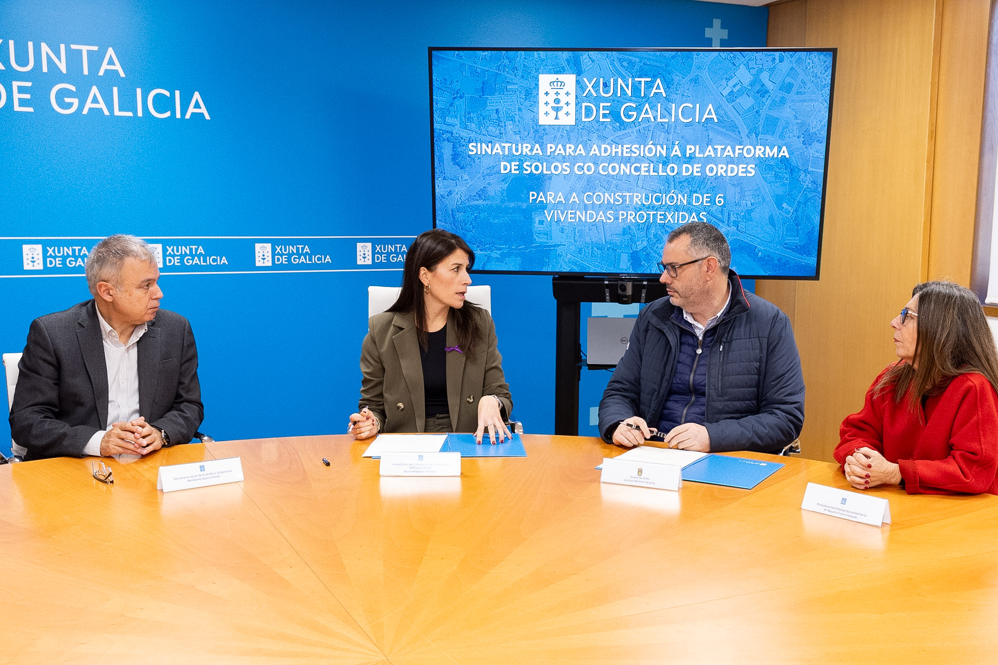 La conselleira de Vivenda e Planificación de Infraestruturas, María M. Allegue, junto con el secretario general de Vivienda y Urbanismo, Heriberto García Porto ha firmado hoy con el alcalde de Ordes, José Luis Martínez Sanjurjo, el convenio enmarcado en el Programa de oferta de suelo de titularidad de las entidades locales para la construcción de vivienda protegida en este municipio. En la firma del convenio también estuvo la jefa territorial de la Consellería en A Coruña, Begoña Freire.