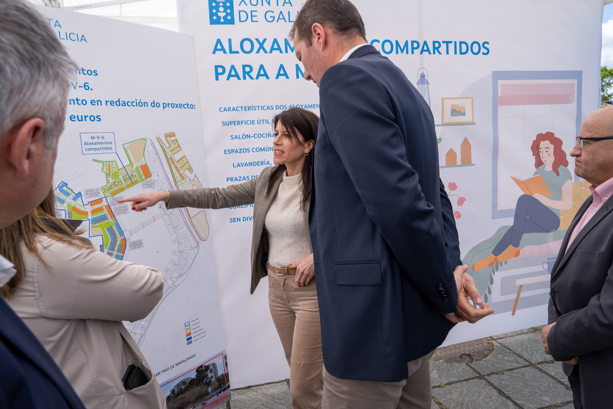 Allegue destaca el fuerte compromiso de la Xunta con la vivienda en Vigo, poniendo como ejemplo Navia, barrio en el que el Gobierno gallego lleva invertido 132M€, de los que 15,6M€ son fondos europeos, lo que representa el 11%. La conselleira destacó, en este sentido, que Galicia es una comunidad cumplidora y que tiene ejecutados el 100% de los fondos MRR que se le habían asignado para vivienda hasta ahora.