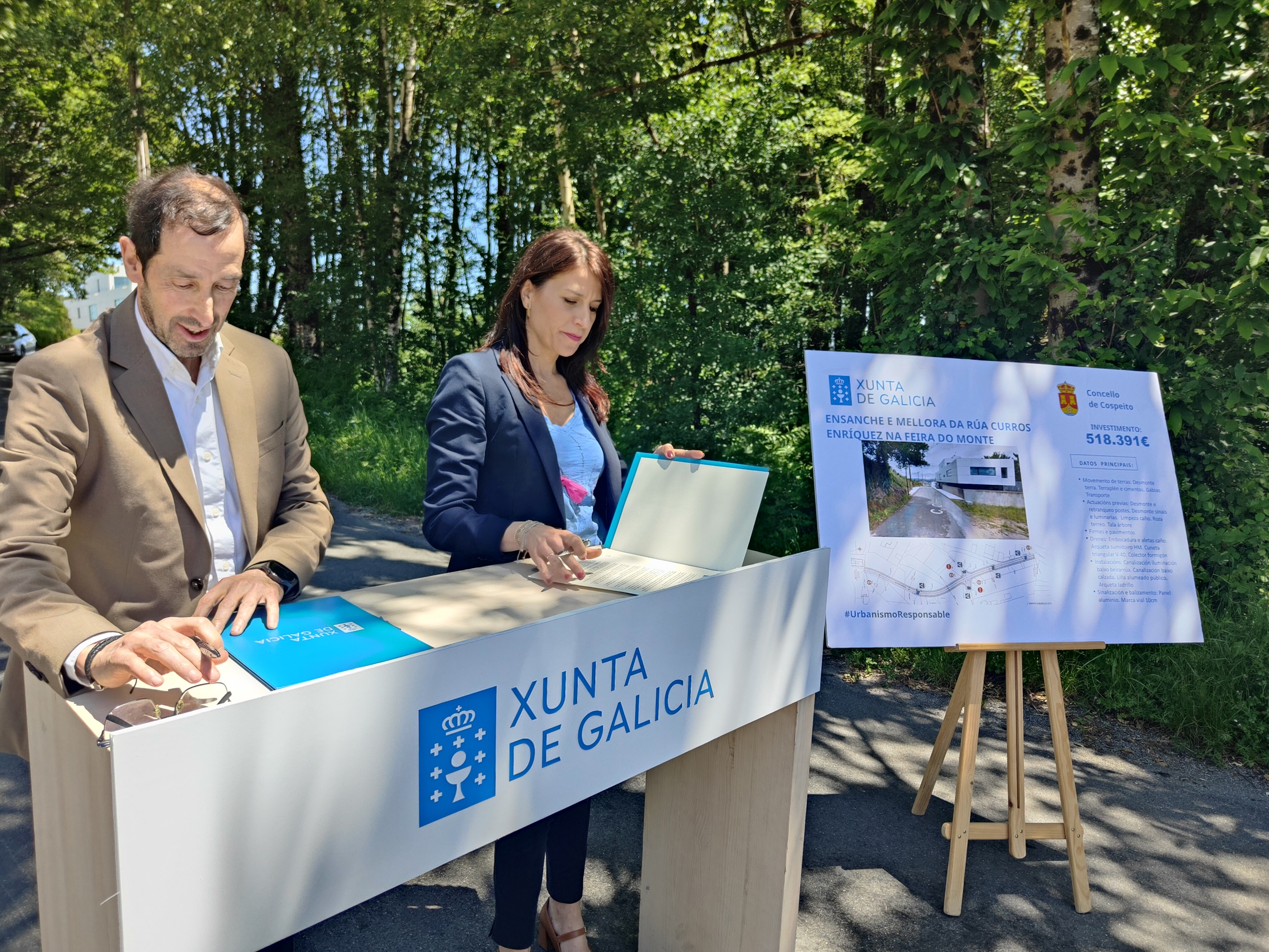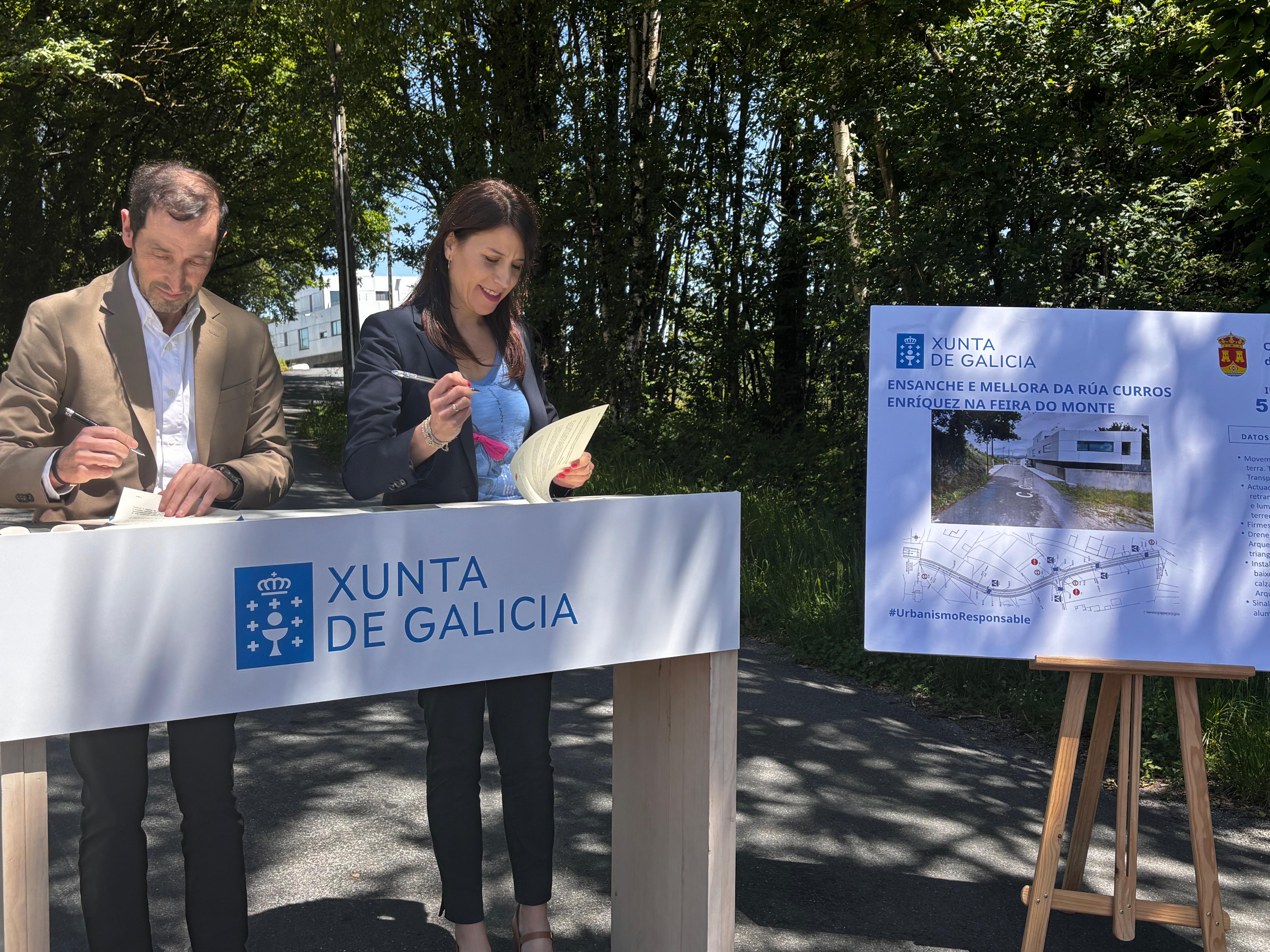 La Xunta colaborará con el Ayuntamiento de Cospeito en las obras de ensanche y mejora de la calle Curros Enríquez, en el lugar de Feira do Monte, que supondrán una inversión de casi 520.000 € (518.391 €). La conselleira de Vivenda e Planificación de Infraestruturas, María Martínez Allegue, firmó hoy con el alcalde de Cospeito, Armando Castosa, el convenio de colaboración para abordar estos trabajos, que se enmarcan en el Plan Hurbe.