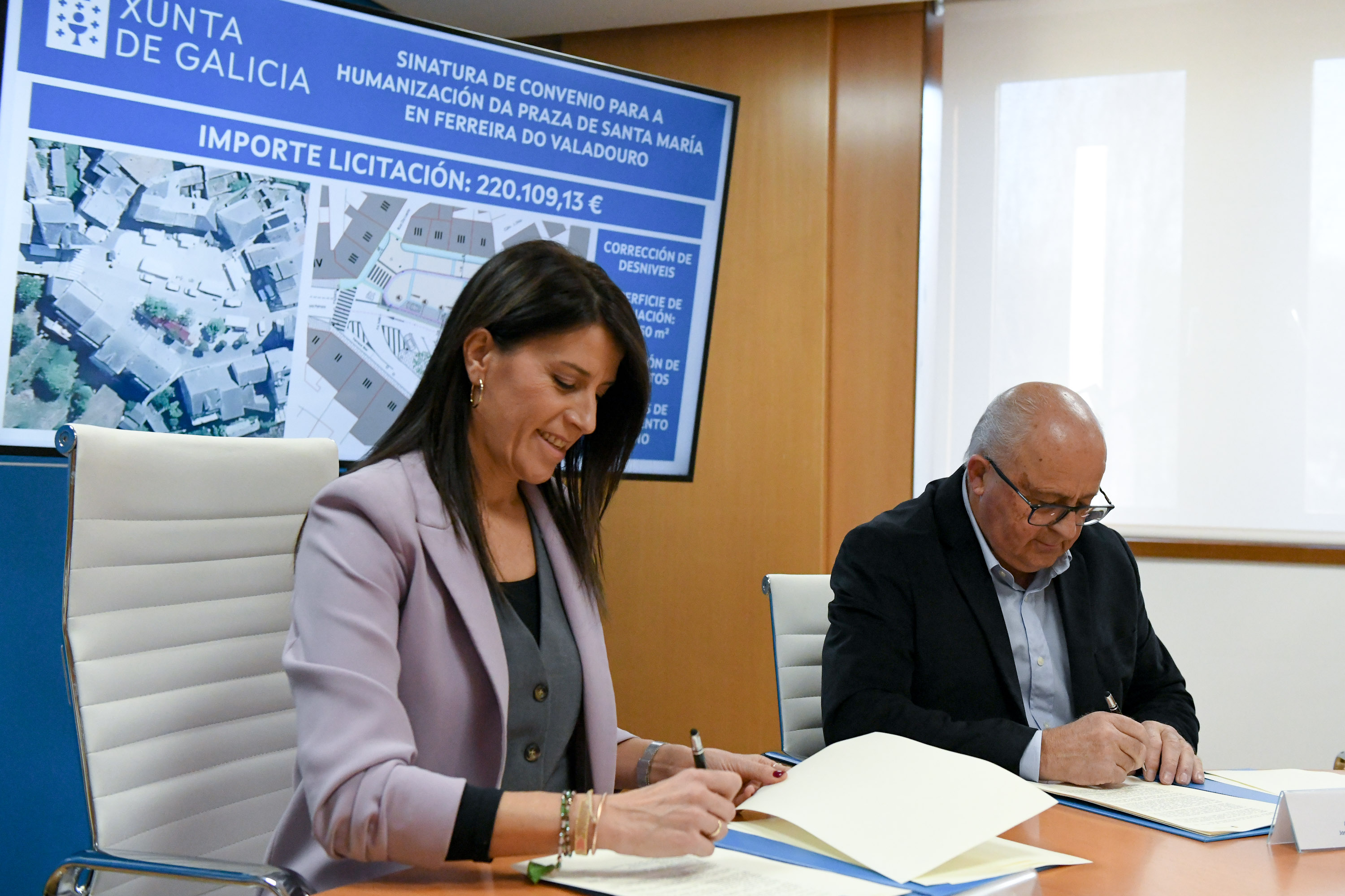 A Xunta colabora con el Ayuntamiento de O Valadouro en la humanización de la plaza de Santa María, en Ferreira, que supondrá una inversión de alrededor de 220.000 €. La conselleira de Vivenda e Planificación de Infraestruturas, María M. Allegue, junto a la directora general de Urbanismo, Encarnación Rivas, firmó hoy con el alcalde de este municipio lucense, José Manuel Lamela, el convenio para abordar esta actuación, que se enmarca en el Plan Hurbe de la Xunta.