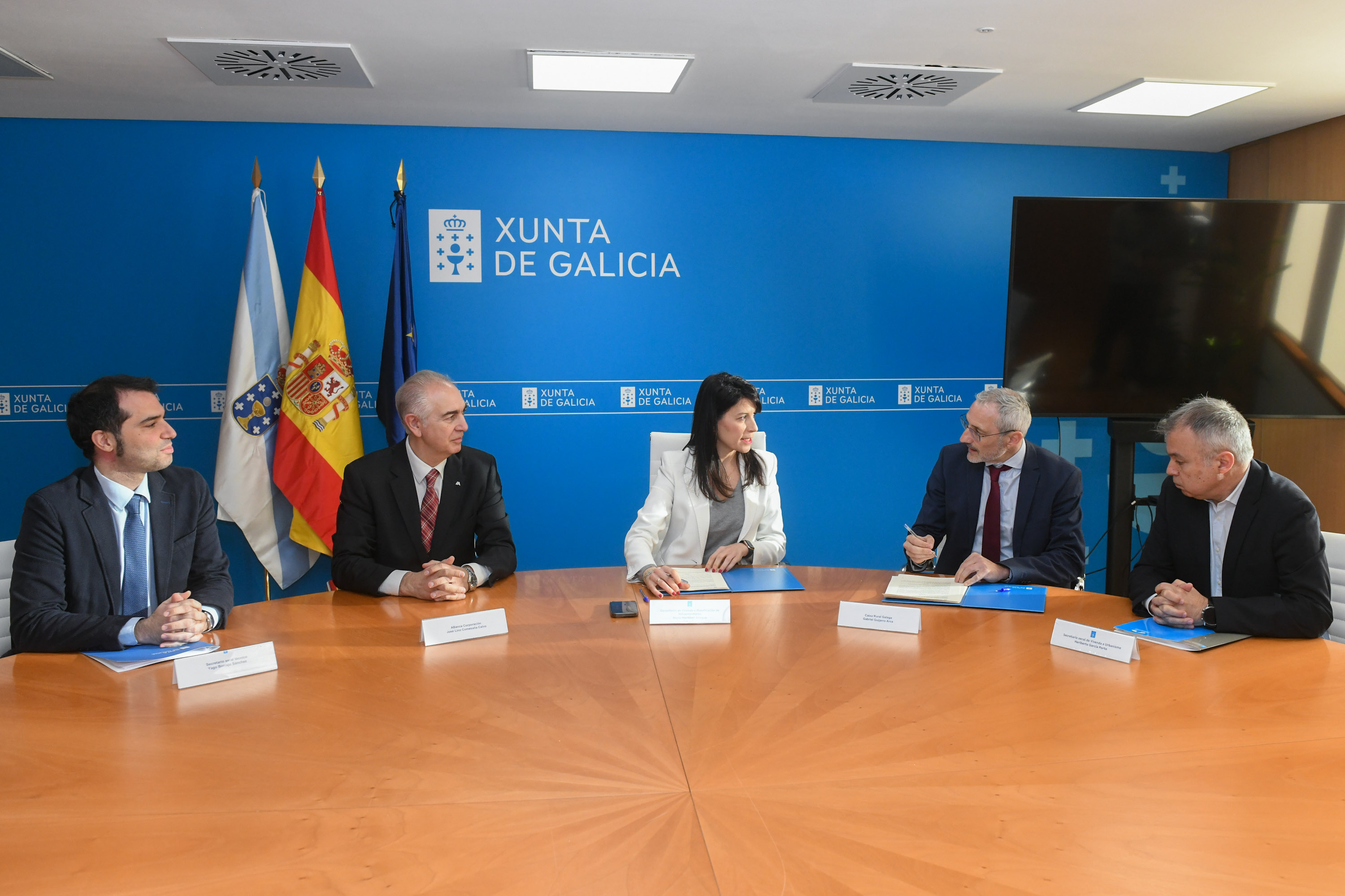 La conselleira de Vivenda e Planificación de Infraestruturas, María M. Allegue, junto con el secretario general técnico, Yago Borrajo Sánchez, y el secretario general de Vivienda y Urbanismo, Heriberto García Porto, firmó hoy el convenio de colaboración con Abanca y Caja Rural, en el que se fijan los términos y condiciones para la concesión de los avales a la adquisición de la Xunta en este 2025. El director de Negocio Institucional de Abanca en Galicia, José Lino Comesaña, y el subdirector general de Caja Rural Gallega, Gabriel Guijarro Arca firmaron el acuerdo en representación de las entidades bancarias adheridas.
