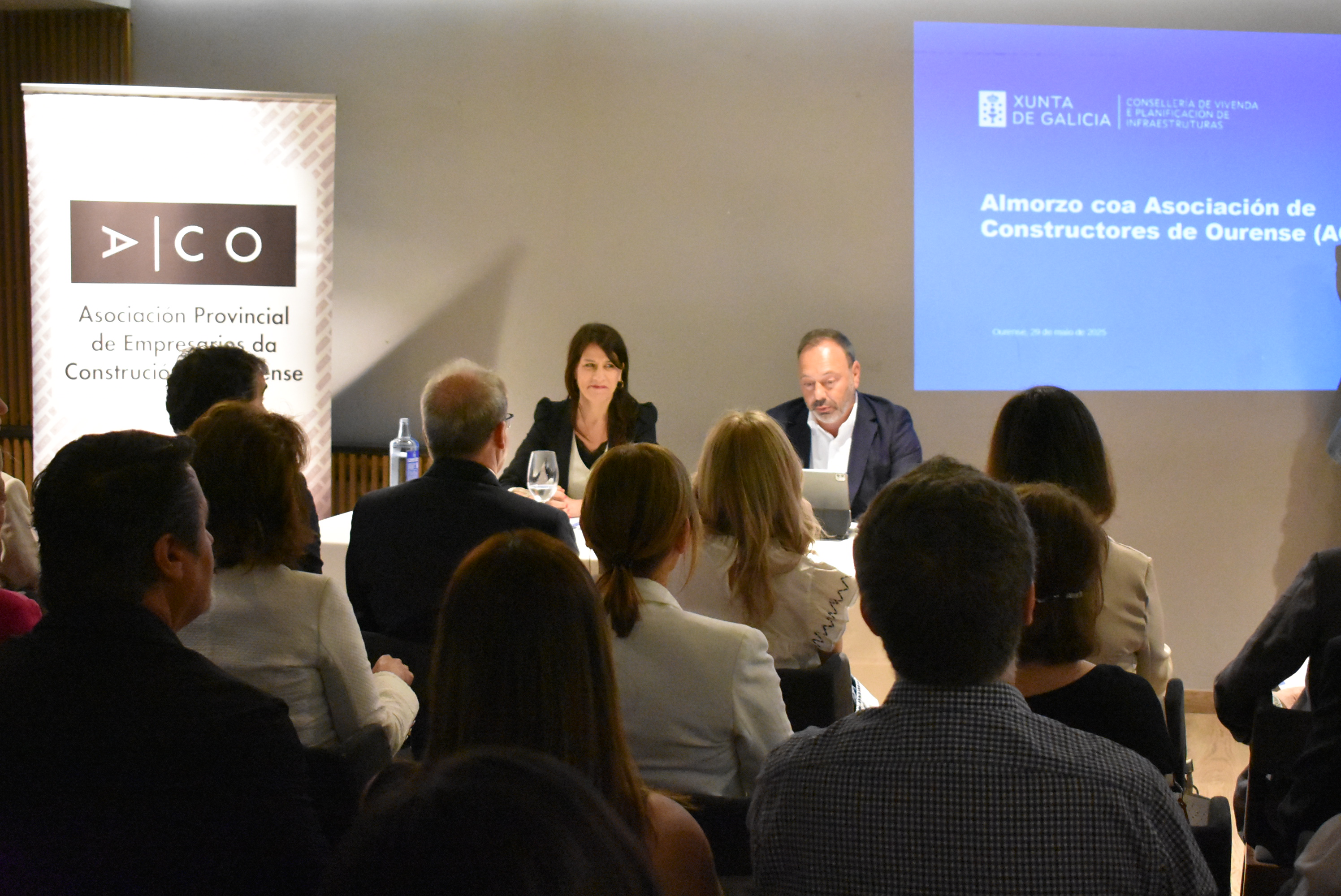 La conselleira de Vivenda e Planificación de Infraestructuras, María M. Allegue, junto al delegado territorial de la Xunta en Ourense, Manuel Pardo Cid, mantuvo hoy en Ourense un encuentro con más de medio centenar de representantes de entidades del sector integradas en la Asociación Provincial de Empresarios de la Construcción de Ourense (ACO).
