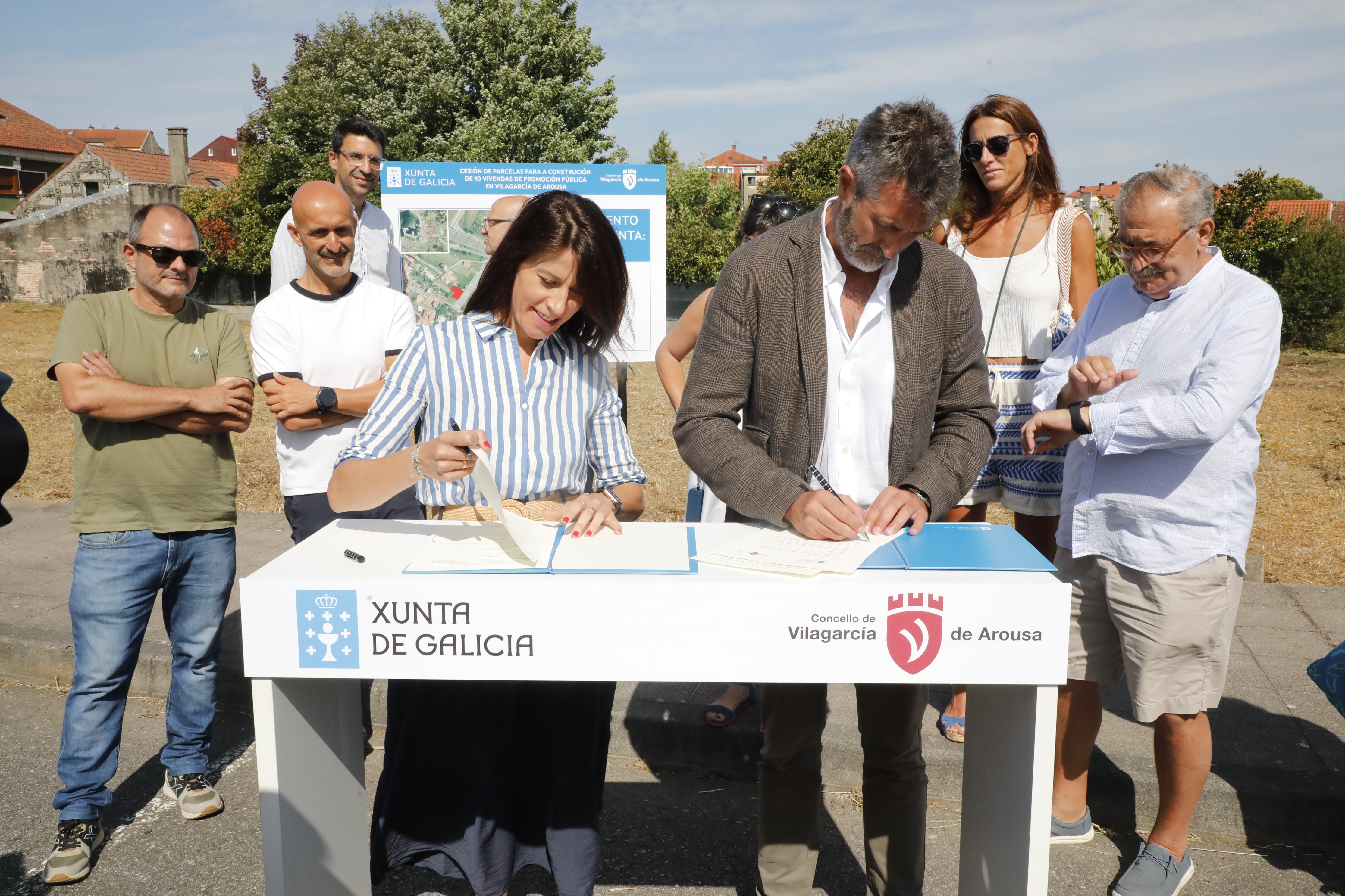 La conselleira de Vivenda e Planificación de Infraestruturas, María M. Allegue, firmó hoy el convenio para la cesión gratuita de una parcela para la construcción de un edificio de promoción pública para diez viviendas en Vilagarcía. Situada en Marxión, cuenta con una superficie de 675 metros cuadrados.