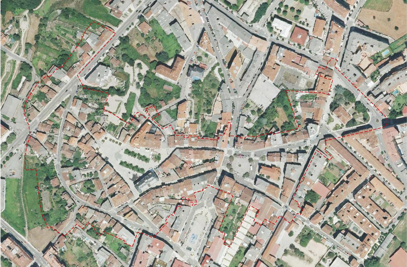 A delimitación do ámbito comprende a orixinalmente establecida na ordenanza tipo Casco Vello e que aparece establecida nos planos de ordenación do Casco Vello 1/1000 do Plan Xeral de Ordenación Municipal (en diante, PXOM) inicialmente aprobado polo Concello de Ponteareas, así como todos os edificios recollidos no Catálogo dos Bens do Patrimonio Cultural do Medio Rural e Urbano de Ponteareas, e que se atopan en contacto co límite marcado para o Casco Vello polo PXOM. O ámbito queda organizado en torno ás dúas prazas principais da vila, a Praza Maior e a Praza de Bugallal e ocupa unha superficie de 92.875 m2.
