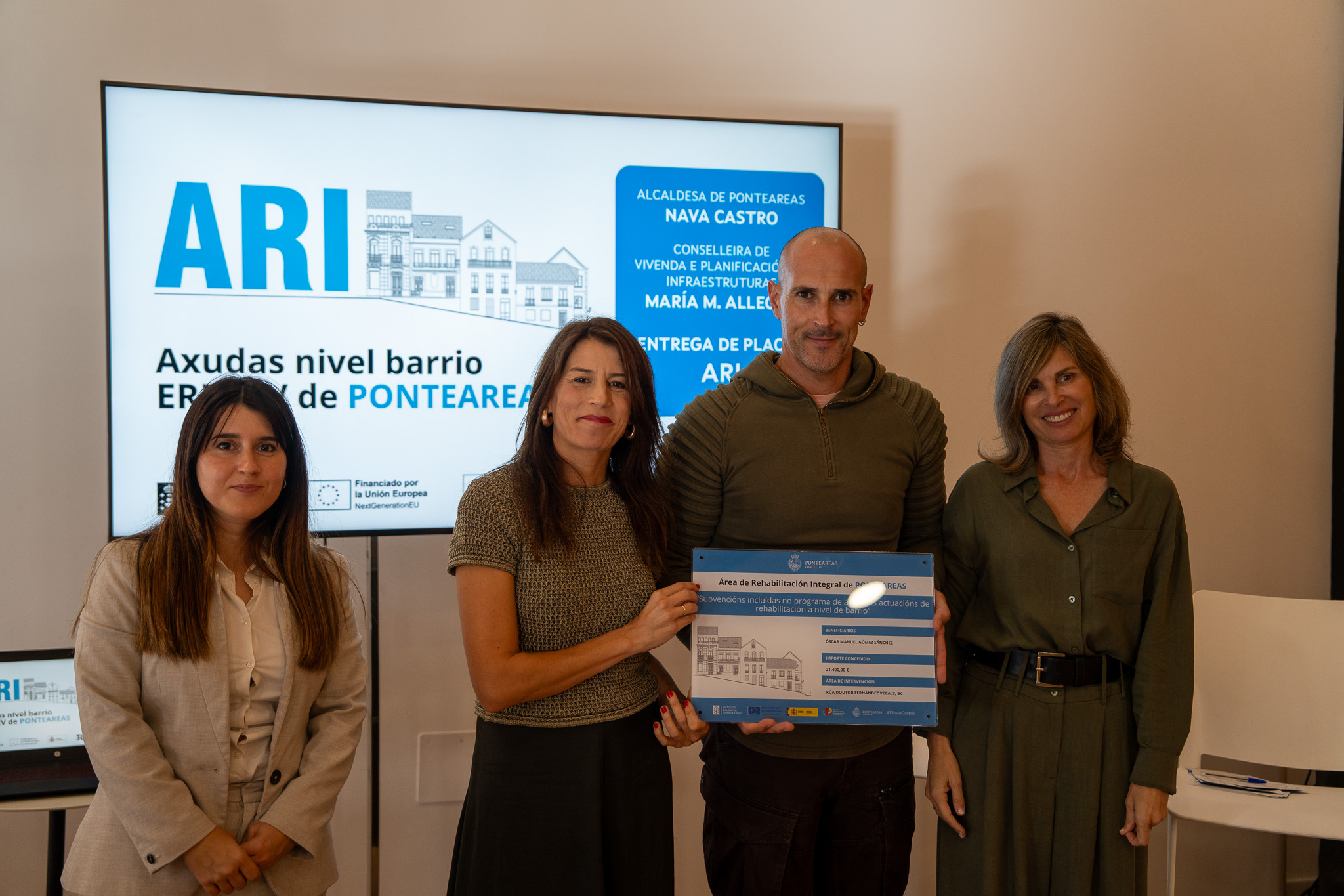 A conselleira de Vivenda e Planificación de Infraestruturas, María M. Allegue, puxo hoxe en valor a recuperación de 16 vivendas no centro histórico de Ponteareas ao abeiro das axudas nivel barrio, que contaron cun investimento total de 400.000€ de fondos europeos. Allegue participou no acto de entrega das placas identificadoras aos propietarios das vivendas rehabilitadas no concello pontevedrés.