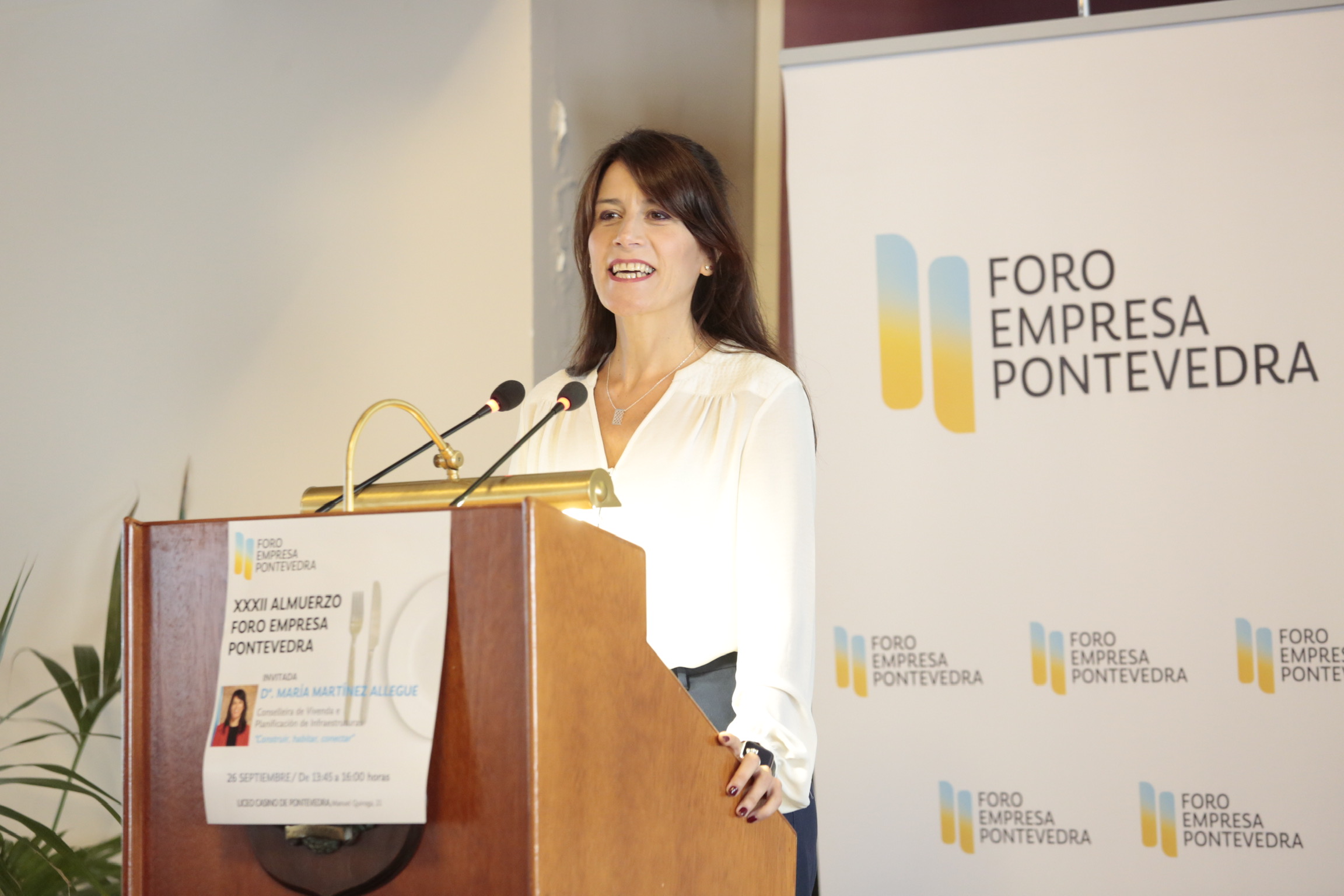 A titular de Vivenda e Planificación de Infraestruturas, María M. Allegue, pronunciou a conferencia ‘Construír. Habitar. Conectar’, no encontro organizado polo Foro Empresa Pontevedra, ao que tamén asistiu o delegado da Xunta en Pontevedra, Agustín Reguera.