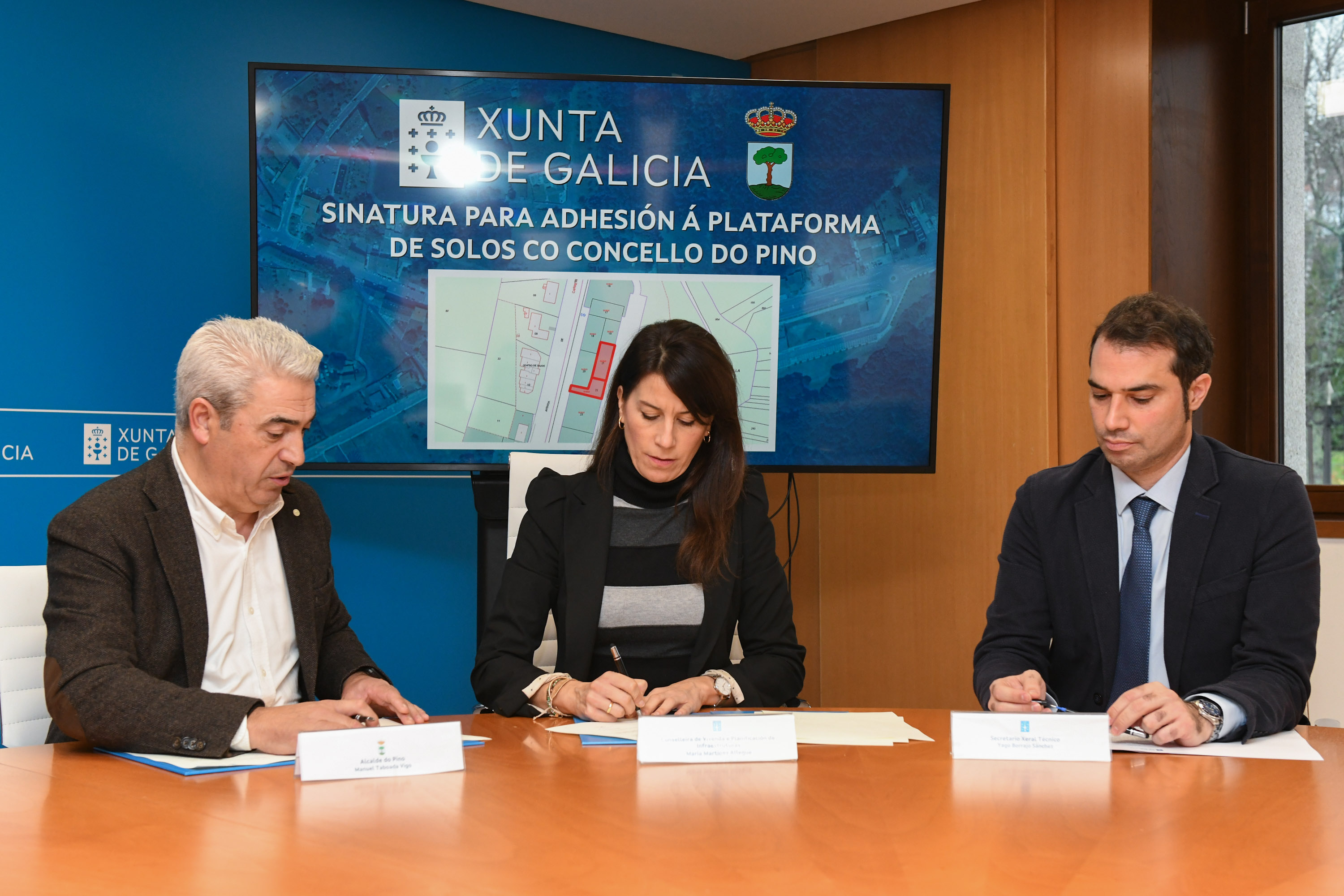 A conselleira de Vivenda e Planificación de Infraestruturas, María M. Allegue, xunto co secretario xeral técnico da consellería, Yago Borrajo, asinou hoxe co alcalde do Pino, Manuel Taboada, o convenio enmarcado no Programa de oferta de solo de titularidade das entidades locais para a construción de vivenda protexida neste municipio.