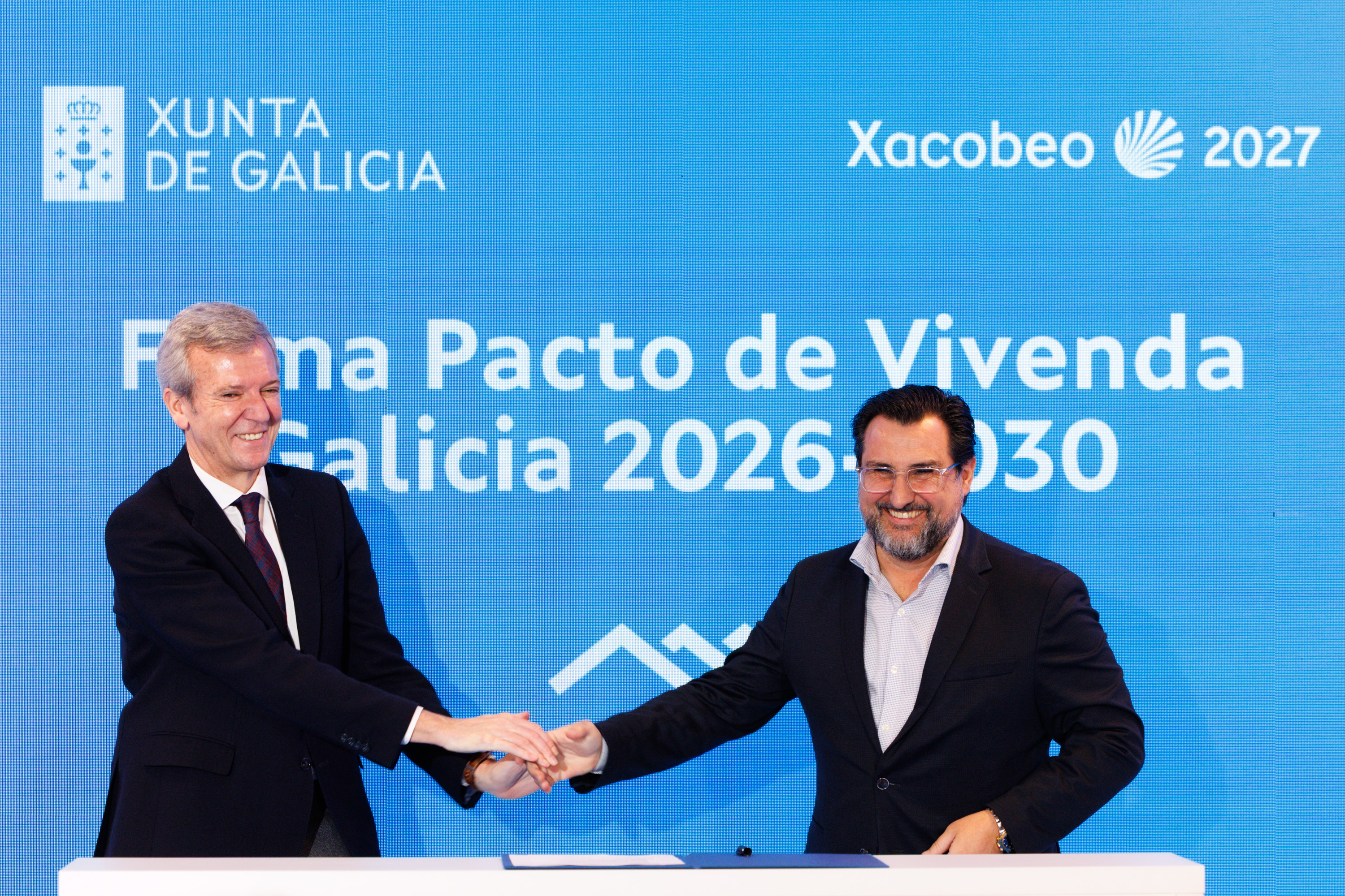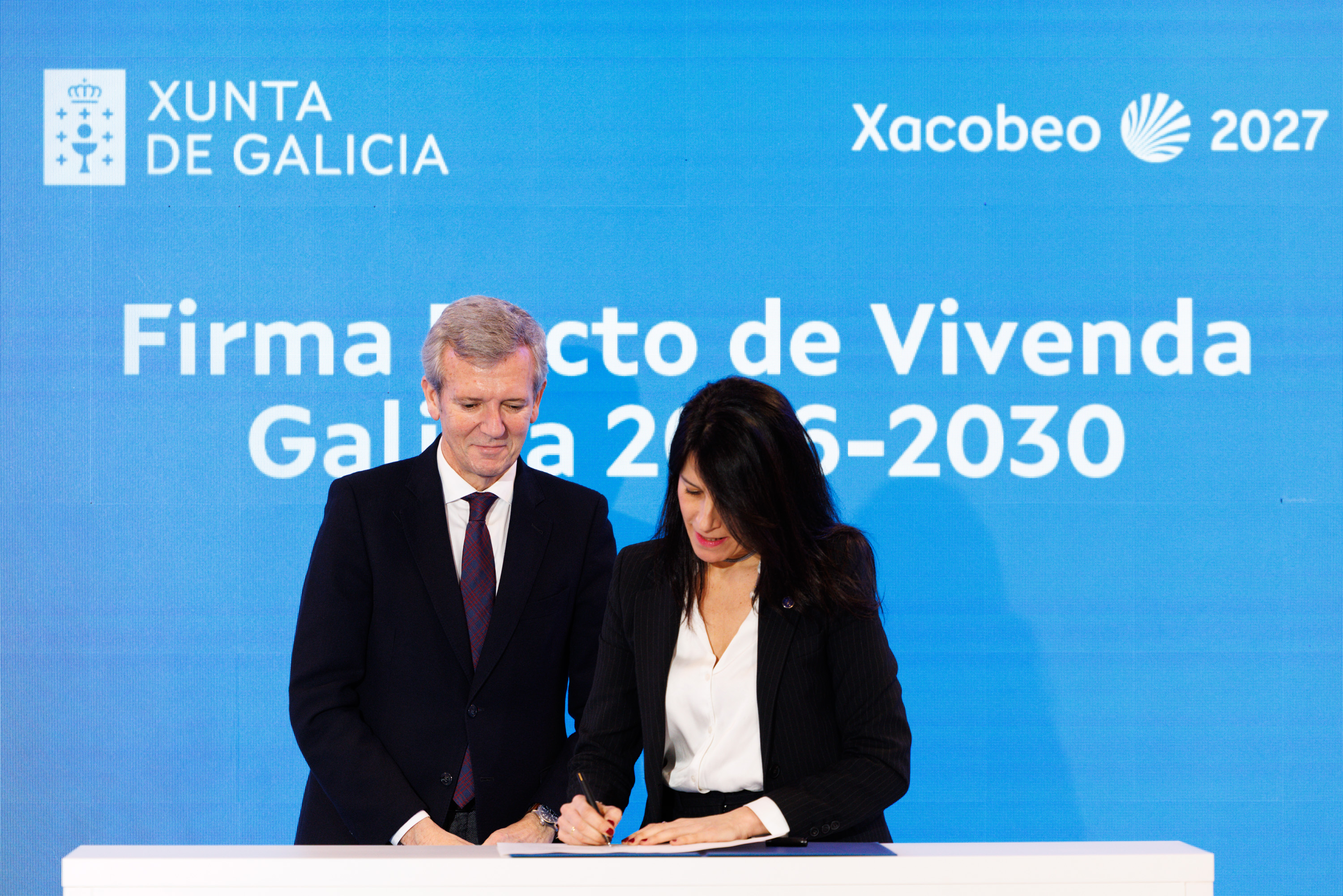 O presidente da Xunta, Alfonso Rueda, presidiu hoxe a sinatura do II Pacto de Vivenda de Galicia 2026-2030, unha folla de ruta estratéxica para, tal e como explicou, “acadar as 10.000 vivendas públicas no ano 2030”, o que require un esforzo investidor directo por parte da administración autonómica de case 2.000 millóns de euros.