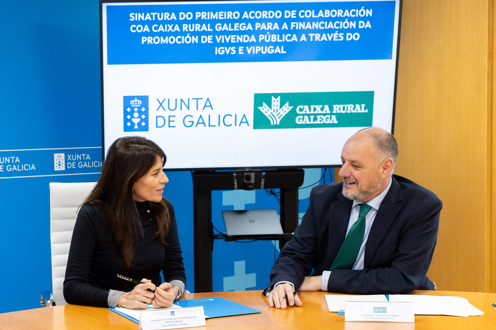 A conselleira de Vivenda e Planificación de Infraestruturas, María M. Allegue, asinou esta tarde un novo acordo de colaboración para o financiamento da promoción de vivenda pública co director xeral da Caixa Rural Galega, Sociedade Cooperativa de Crédito Limitada Galega, Jesús Antonio Méndez Álvarez Cedrón.
